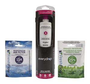 Everydrop® Refrigerator Water Filter 5 - EDR5RXD1 (Pack Of 1) + Refrigerator FreshFlow™ Air Filter + FreshFlow Produce Preserver RefillThis bundle helps you get the most out of our refrigerator. The WATER FILTER is certified to reduce 99% of lead as well as other potentially harmful contaminants. Everydrop® Ice & Water Refrigerator Filter 5 replaces PWF-NL240V. The FreshFlow™ AIR FILTER reduces common food odors in the refrigerator and is 15 times more powerful than baking soda. Replacing the air filter will require no disassembly or repair experience. The PRODUCE PRESEVER absorbs ethylene allowing the ripening process of many produce items to slow down. As a result, certain produce items will stay fresh longer that are kept in your crisper drawer. It extends freshness of produce up to 25%. Packet contains two pouches which will be put in the housing in your crisper drawer. Packet also contains a status indicator to help you remember to change the pouches. It is recommended to replace your everydrop® filter every 6 months (or 200 gallons), and also recommended to replace the air filter and produce preserver every six months