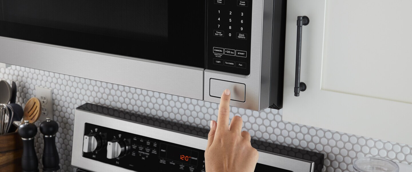 Hand pressing push button on over-the-range microwave. Hand pressing push button on over-the-range microwave.
