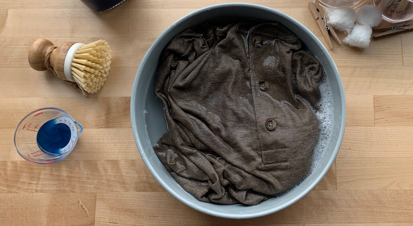 Fill your sink or a large bowl with cold water and add some detergent. Use enzyme detergent for polyester, nylon or spandex and gentle detergent for wool, silk, linen, rayon or acrylic garments. As always, check your garment labels to be sure. Let the fabric soak for at least 30 minutes. You can extend the soaking time if the stain is older or more stubborn.